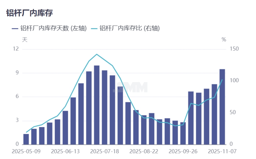 厂内库存持续堆积,资金占用压力倒逼减产:据SMM统计,时间截止2025年11月7日,铝杆厂内库存天数达到9.48天,环比10月初增加2.8天。在经历完国庆假期后,铝杆厂家迎来大幅累库的现状。由于厂家对于下游需求预期较好,在资金压力并不大的背景下,保持正常的生产节奏,产量表现出较为稳定的水平。但随着时间地深入,厂家发现下游厂家需求并未如期兑现,同时还因为铝价重心的持续高涨抑制了采购需求,导致厂内库存持续堆积。在库存与资金压力的倒逼之下,铝杆厂家不得不考虑检修减产,以求降低厂内库存减少资金的占用压力,盘活企业现金流。