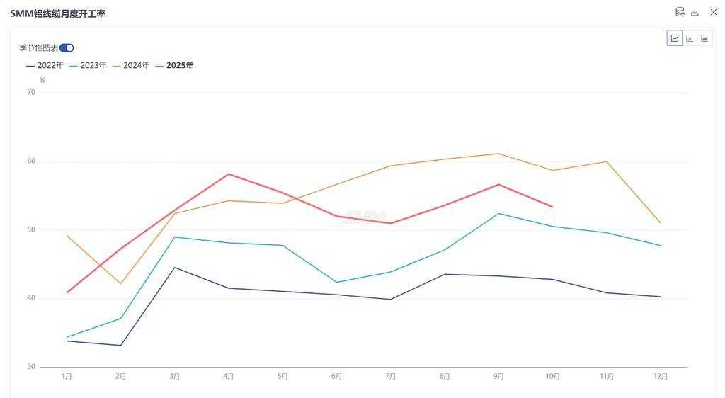需求强预期并无兑现:2025年10月国内铝线缆行业综合开工率录得53.32%,环比9月下跌3.31个百分点,同比下降5.38个百分点。10月线缆企业开工率下跌主要受国庆假期影响,叠加终端提货疲弱,导致厂家开工弱势运行。尽管10月份头部企业高压生产保持负荷运行,但是厂家对于11月份的出货预期纷纷减弱,再加上个别地区受环保监控的影响,铝线缆厂家开工率表现出偏弱走势。与此同时,不少厂家反馈今年电网终端提货积极性不如预期,存在“订单不匹配”,“订单延期”的现状。终端提货疲弱,是导致铝线缆行业提前进入淡季的主要原因。尽管11月初电网招标持续进行,但“只招标,不下单”的现状仍未改变,短期内行业呈现出弱势运行,难以改善。