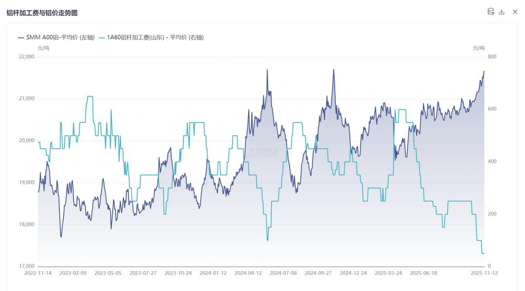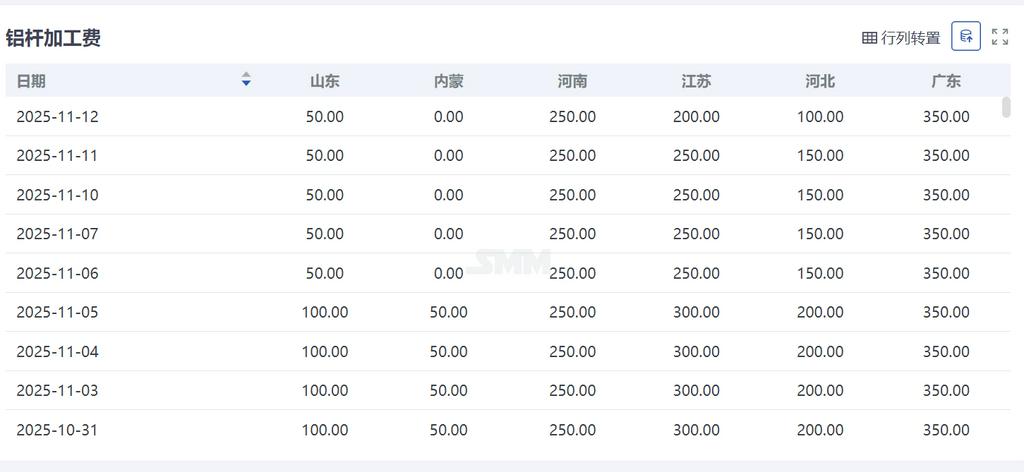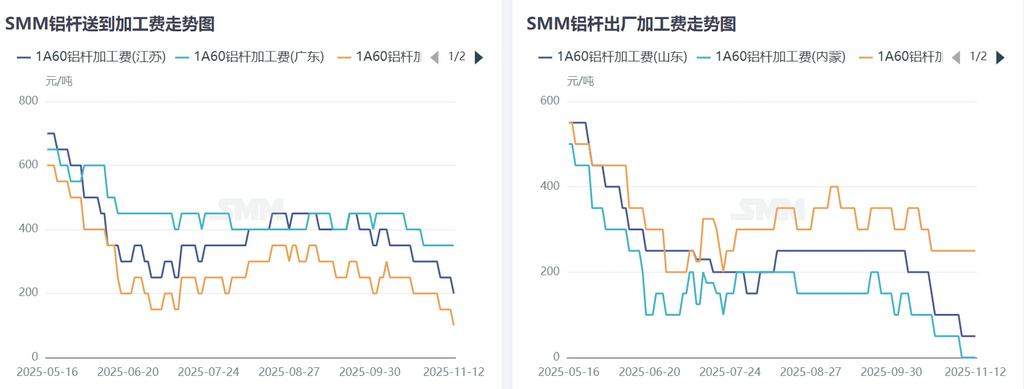 地区加工费持续恶化,加工贸易端接连亏损:据SMM了解,时间截止2025年11月12日,山东地区出厂价在0-100元/吨,内蒙古地区出厂价-100-100元/吨,河南地区出厂价200-300元/吨,河北地区送到价0-200元/吨,江苏地区送到价在100-300元/吨,华南地区送到价在300-400元/吨。由于11月份铝价的重心持续高涨,叠加终端需求疲弱,持货商为求出货加工费一降再降,形成市场加工费恶性竞争。同时也因为铝杆加工费的弱势,部分没有背靠电解铝资源的加工厂面临利润倒挂的压力,而部分厂家则依靠下游年度的框架协议订单维持生产。贸易端方面,由于加工费的持续走弱,手中存在现货的贸易商亦是面临亏损状态,加之下游终端需求并不明朗,贸易端亦不敢贸然接货,多维持谨慎观望。