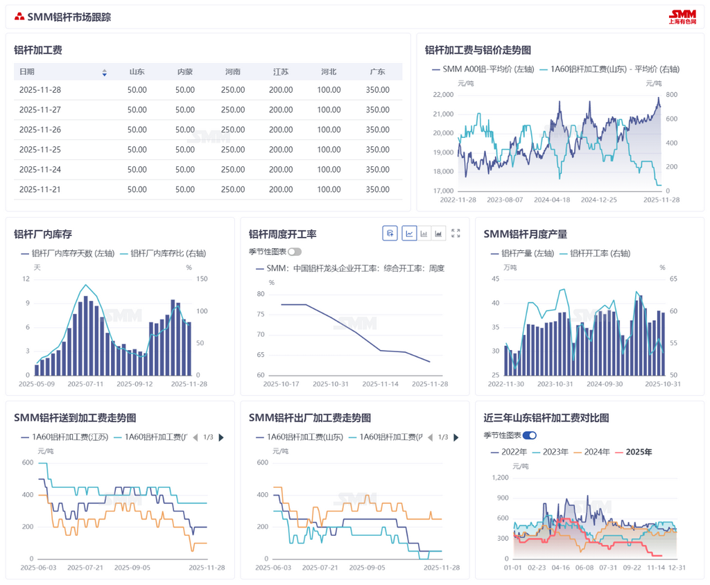 据SMM统计,截至2025年11月28日,国内铝杆厂内库存天数6.68,环比上周减少0.36天,呈现库存去化趋势,供应端压力稍有减轻。库存比方面,国内铝杆厂内库存比录得78.17%,较上周下跌6.74%。近一周铝杆加工费始终位于低位徘徊,再加上铝价表现探底回升,加工费挺价声音略显不足。周内下游接货情绪略有回升,但市场库存仍未消化完毕,供需双方并不平衡的状态下,驱动加工费回升的动力相对乏力。不同加工费方面,截止2025年10月31日,不同贸易地区方面,江苏地区铝杆加工费报价位于200-300元/吨,河北地区加工费报价位于100-200元/吨,华南地区铝杆加工费报价位于300-400元/吨。回归至各地区的铝杆加工费,山东地区报价0-100元/吨,内蒙古地区报价-50-150元/吨,河南地区报价200-300元/吨。当前加工费处于筑底阶段,持续下跌空间十分有限,但加工费的波动与厂内库存及铝价紧密关联,预计进入12月份后铝杆厂内库存将回归至安全水平,为加工费提供基本面支撑。