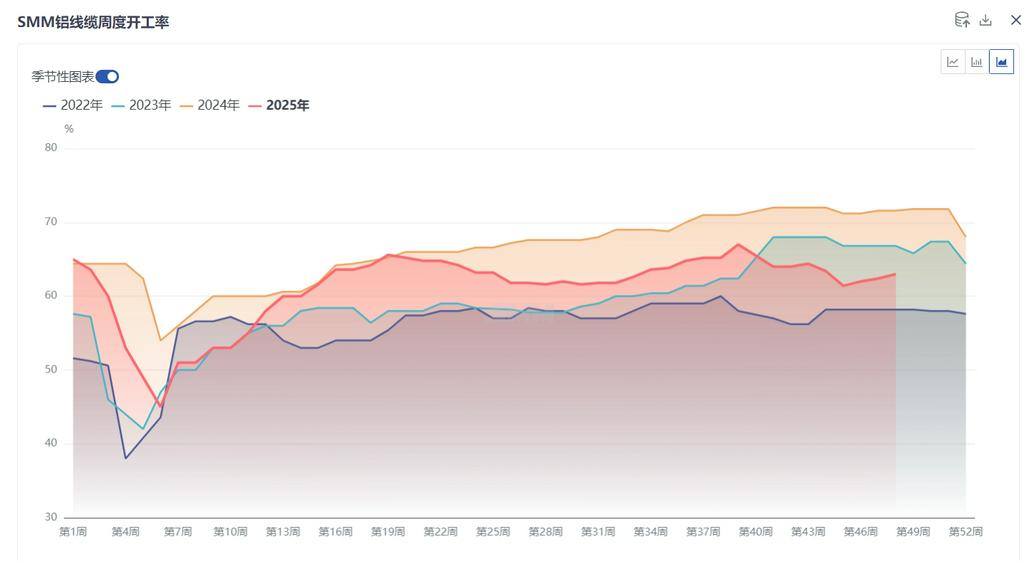 本周铝线缆周度开工率环比回升 0.6 个百分点至 63%,延续温和回升节奏。开工率变动的核心原因在于当前订单略有好转,行业逐步脱离淡季低位水平,为生产恢复提供了支撑。从企业运行情况来看,尽管订单有所改善,但尚未回升至旺季交货节奏,当前进入冬季后,气温影响导致项目施工进展有限,电网端提货持续性的预期转弱,且年尾临近,企业备成品库存的意向不强,仅维持正常交货节奏生产。从行业订单动态来看,尽管11月电网订单进入集中招标的周期,预期12月企业在手订单将出现新一轮的增长,但年内需要交货订单有限,需等待明年电网的集中交货周期的到来,需求中长期维持乐观,但短期内需求弱势依然存在。展望下周,铝线缆开工率虽仍处于回暖通道,但受冬季施工受限、电网提货持续性转弱、年尾备货意愿偏弱以及订单未显著放量的制约,后续回升空间相对有限。