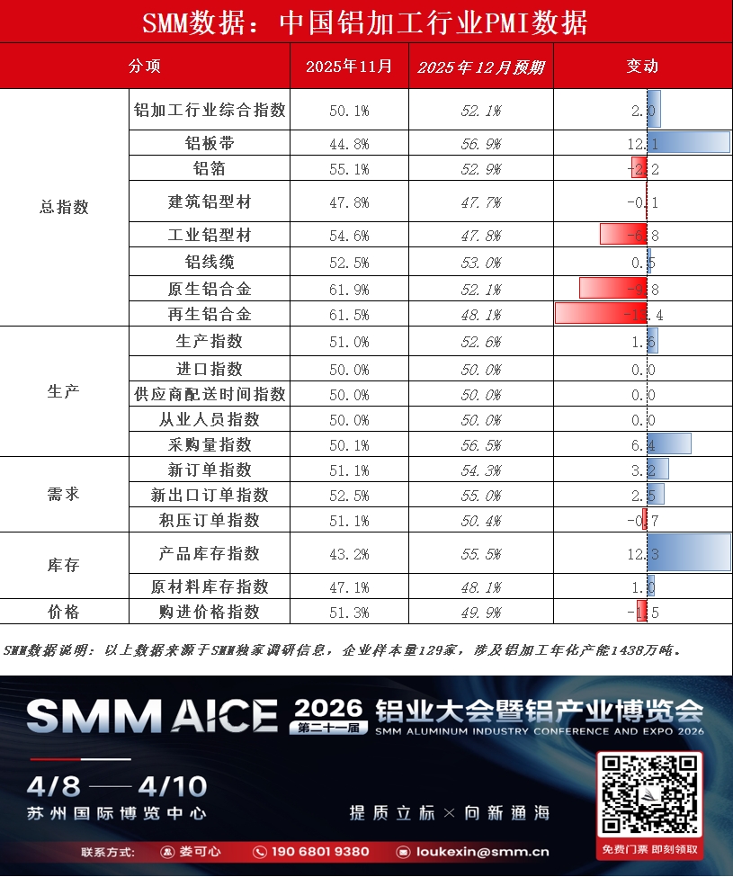 11月铝加工行业PMI录得50.1%——铝加工行业内部分化加剧 年末景气度预计承压【SMM下游深度分析】