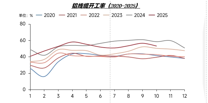 据SMM统计,2025年10月国内铝线缆行业综合开工率录得53.32%,环比9月下跌3.31个百分点,同比下降5.38个百分点。