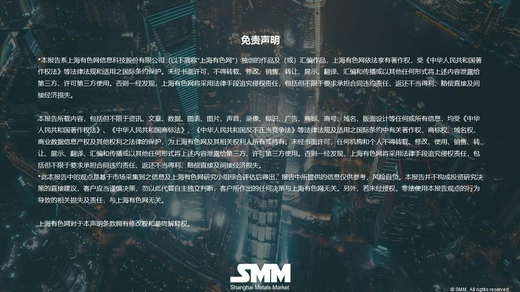 上海有色网原创信息未经书面授权,禁止传播、发布、复制(包括但不限于行情数据、价格信息、市场统计信息、调研信息等)。授权请联系021-3133 0333。上海有色网保留追究侵权及不当引用的权利。本原创信息除公开信息外的其他数据均是基于公开信息(包括但不仅限于行业新闻、研讨会、展览会、企业财报、券商报告、国家统计局数据、海关进出口数据、各大协会和机构公布的各类数据等等),并依托SMM内部数据库模型,由研究小组进行综合分析和合理推断得出,仅供参考,不构成决策建议,客户决策应自主判断,与上海有色网无关。