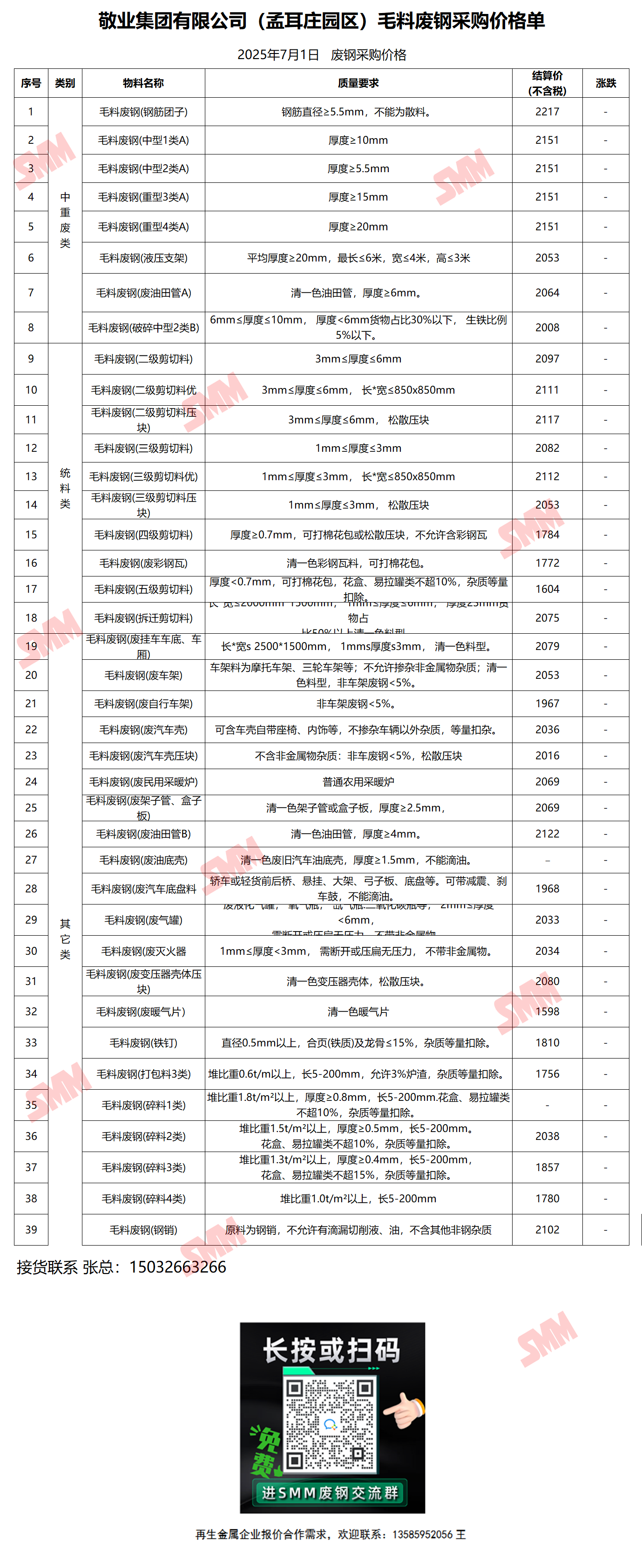 7月1日敬业钢铁(孟耳庄园区) 废钢采购报价