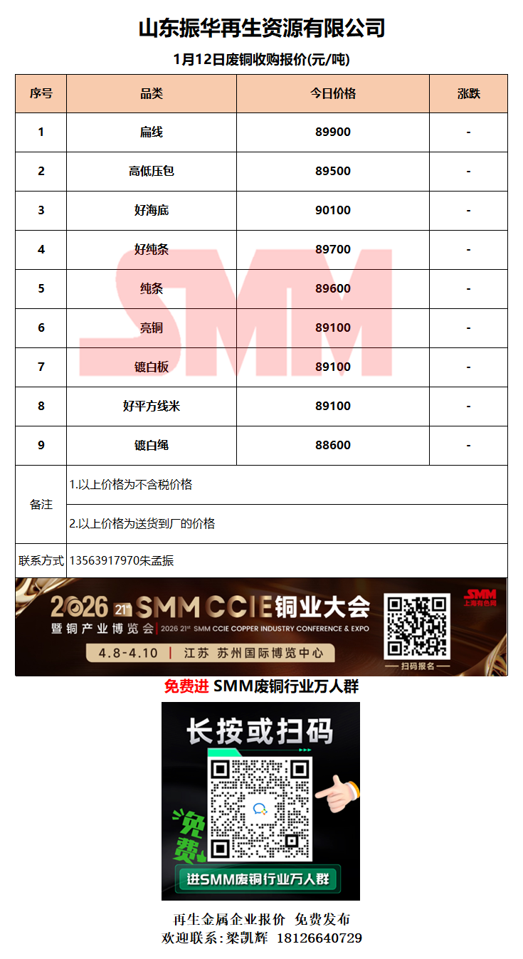1月12日山东振华 废铜采购报价