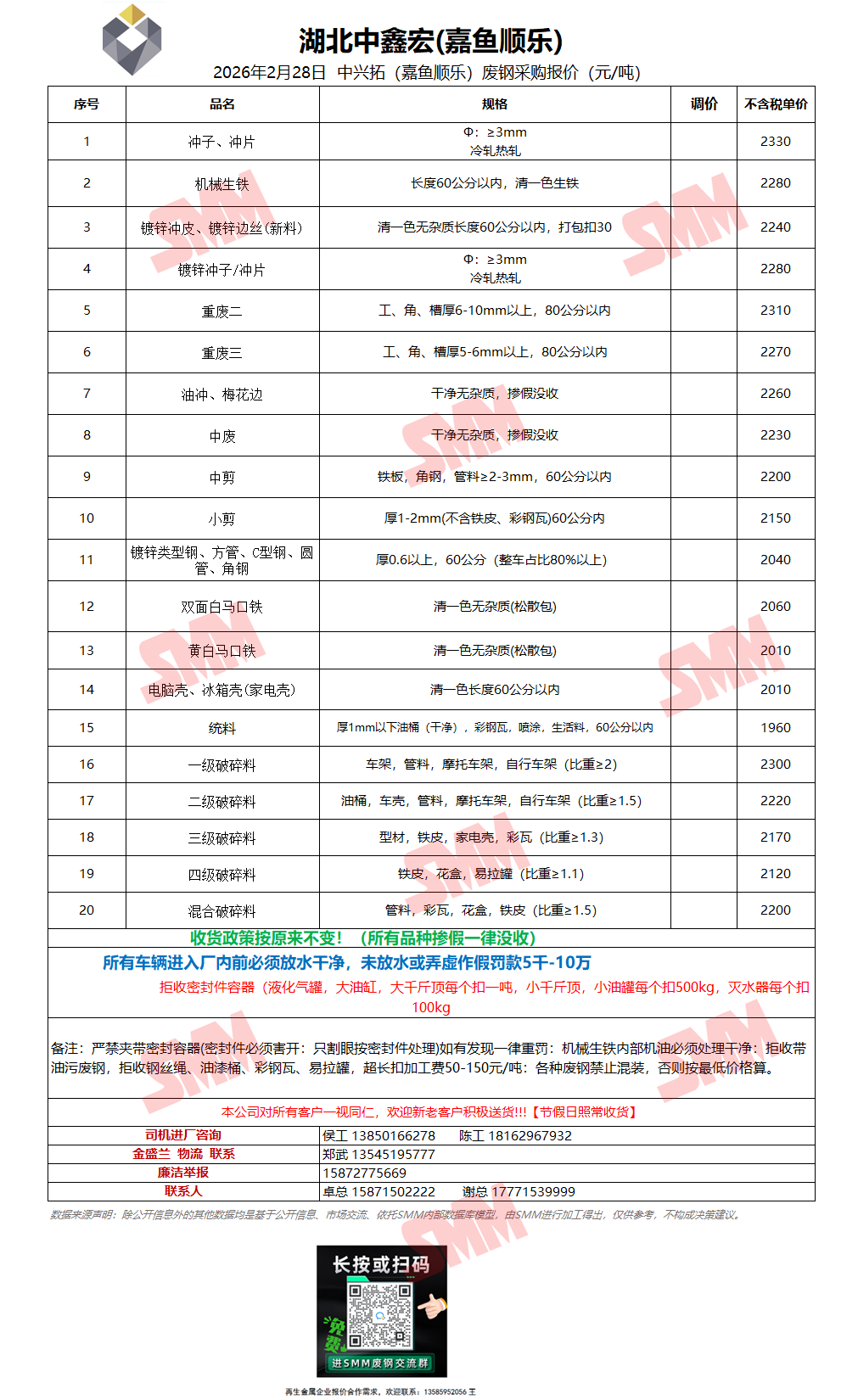2月28日湖北中鑫宏(嘉鱼顺乐) 废钢采购报价