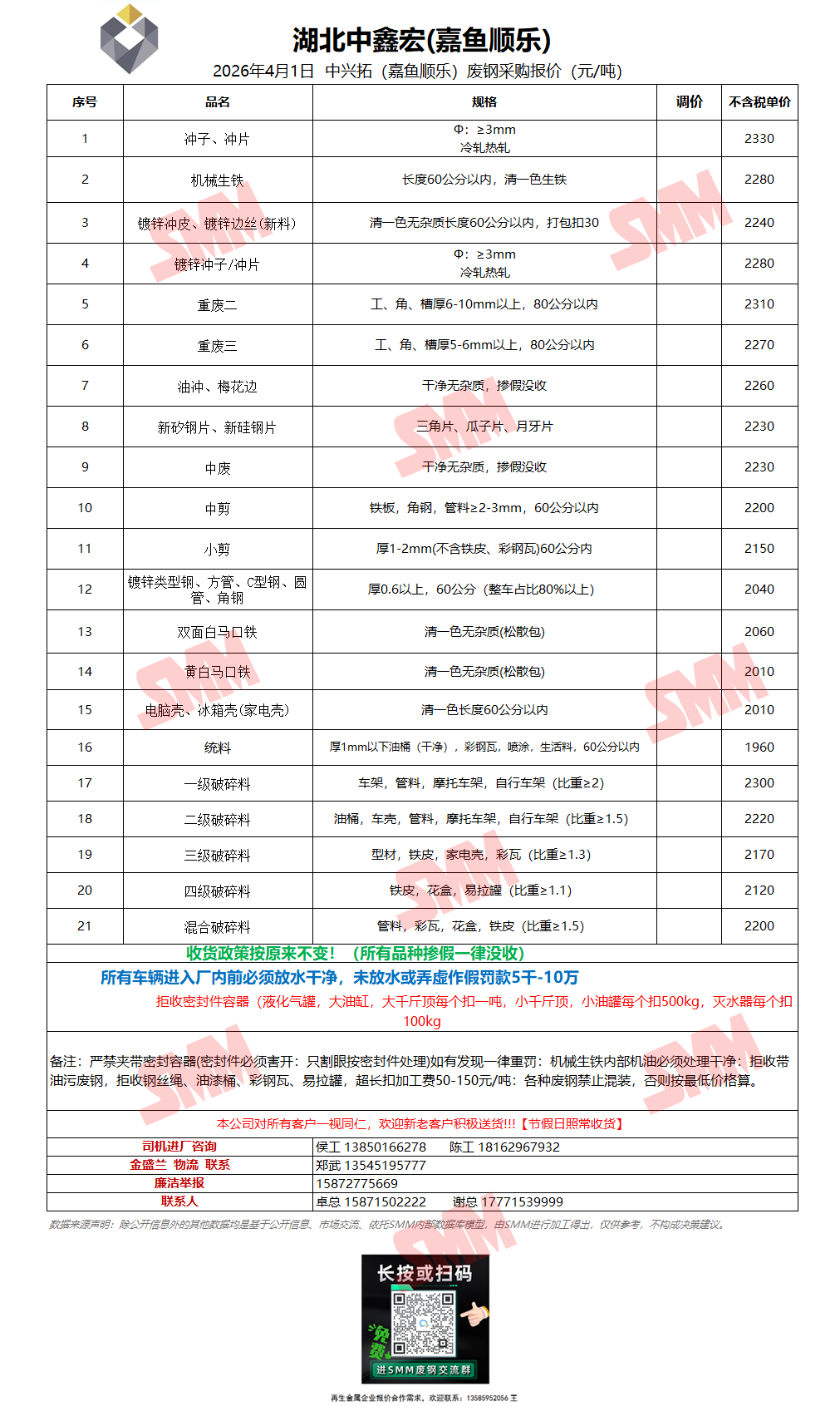 4月1日湖北中鑫宏(嘉鱼顺乐) 废钢采购报价